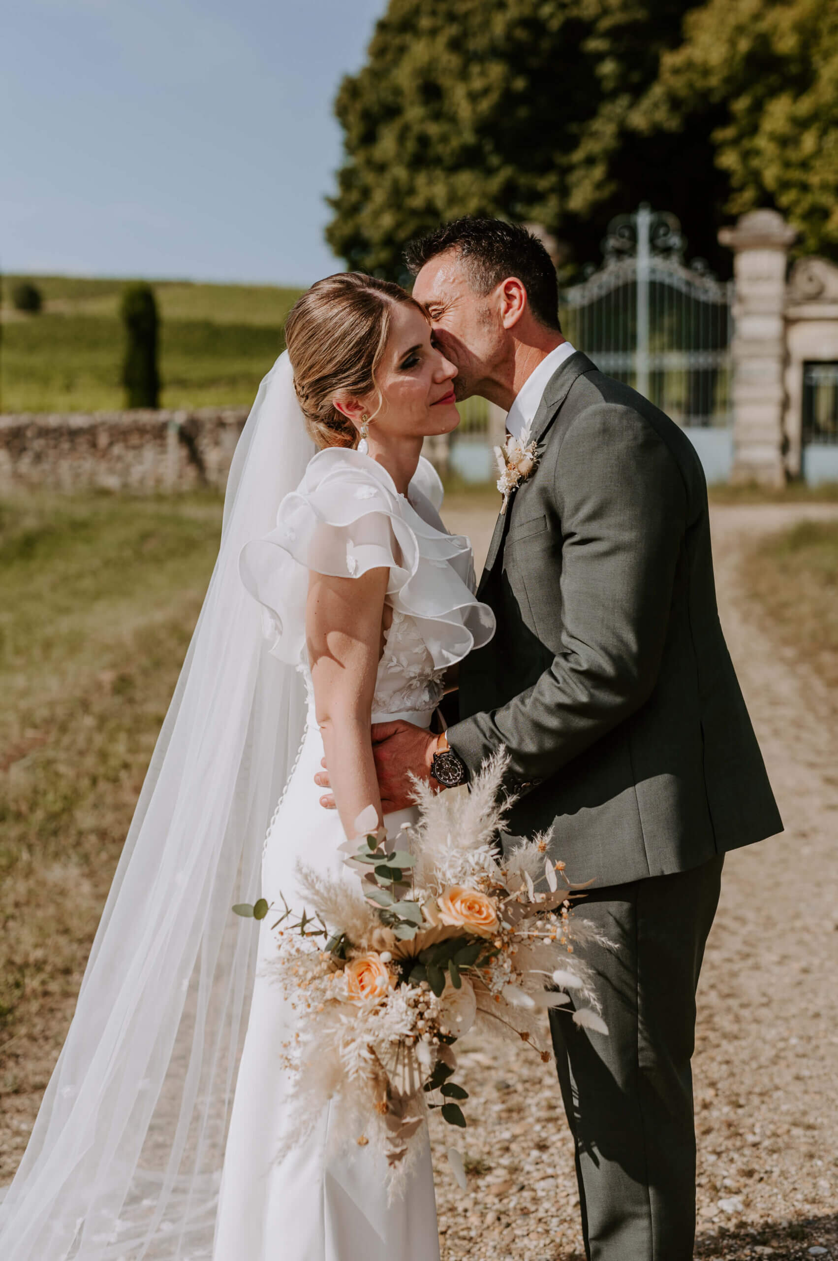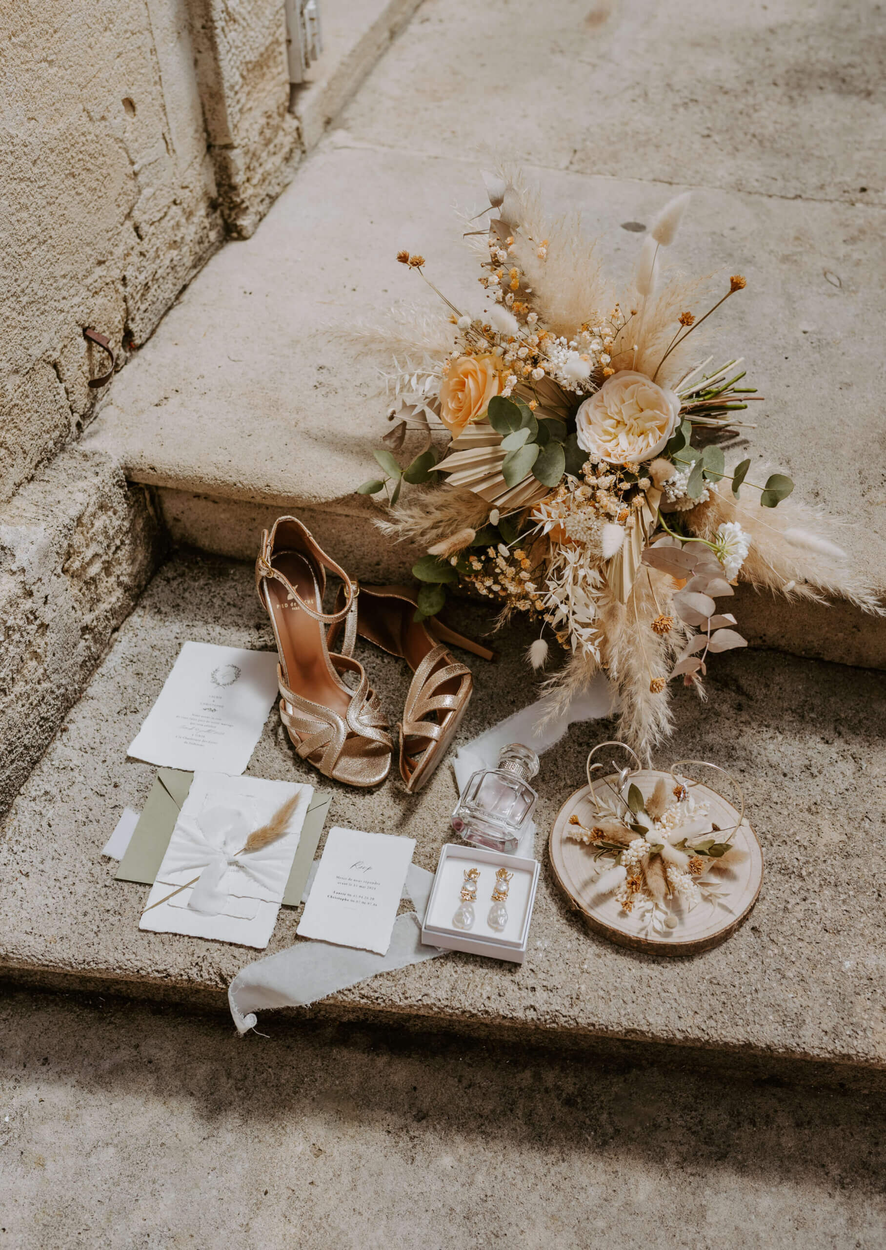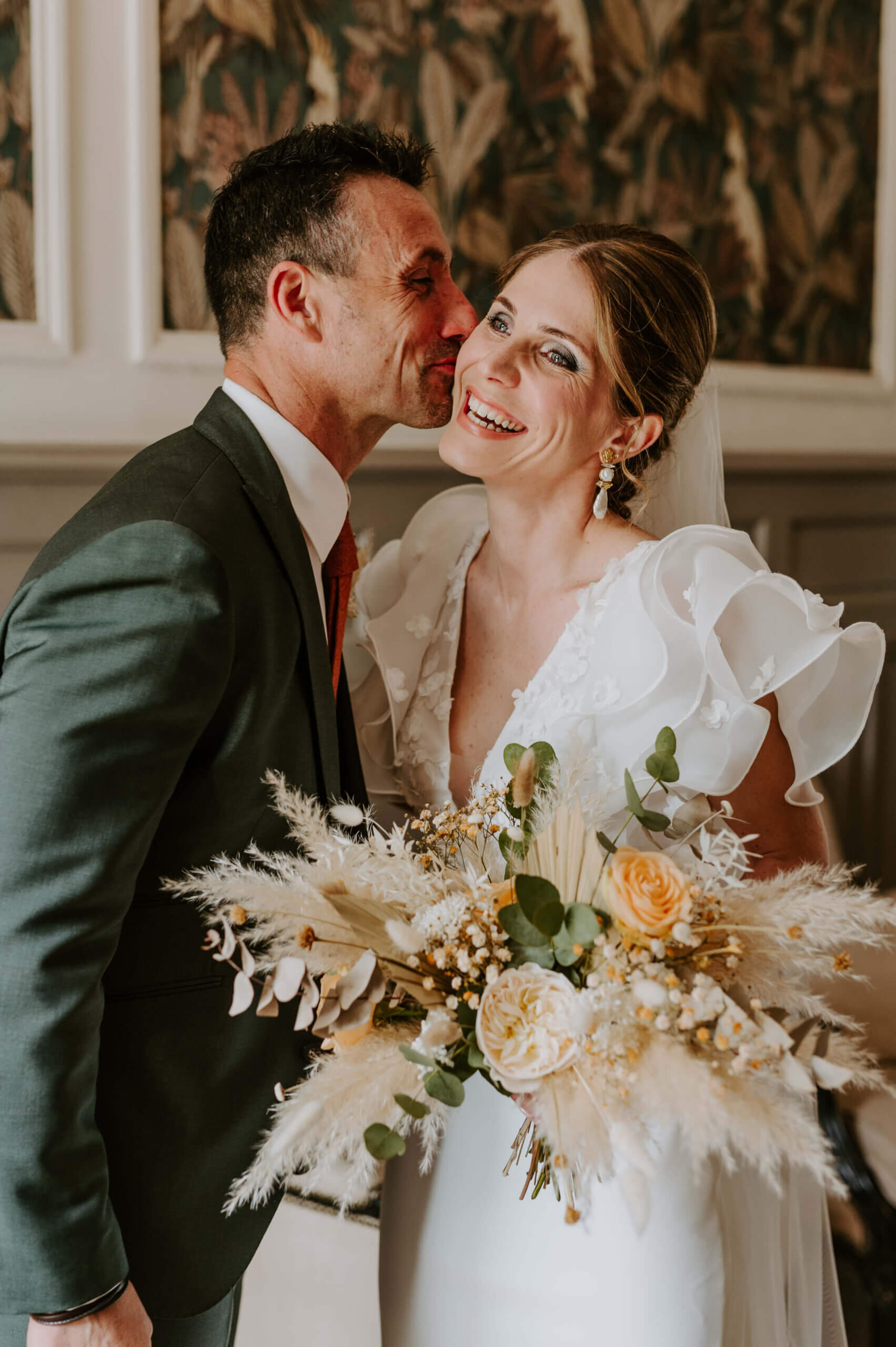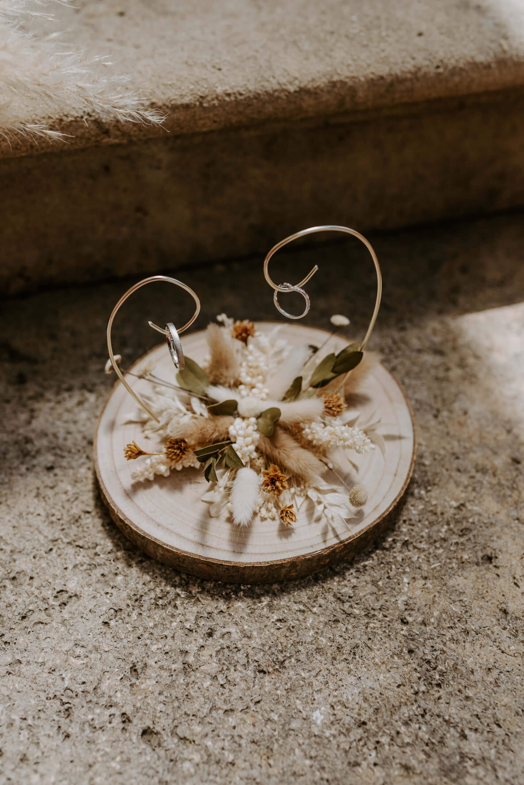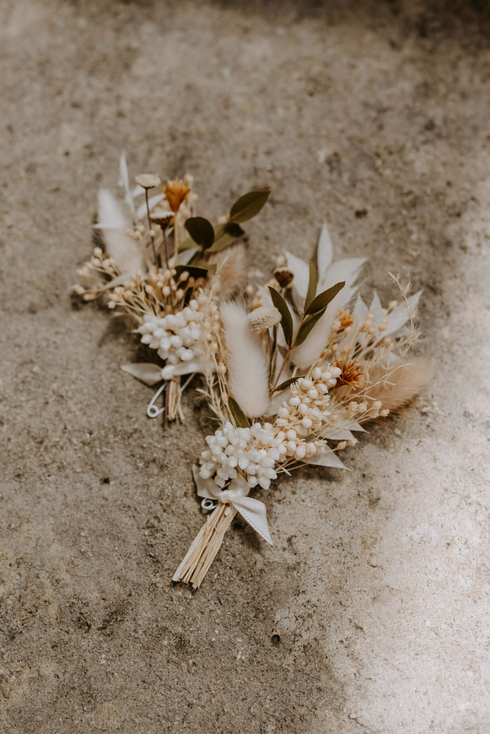 Les mariés ont fait le choix d’accessoires uniquement en fleurs séchées, l’occasion de préserver ces souvenirs du mariage