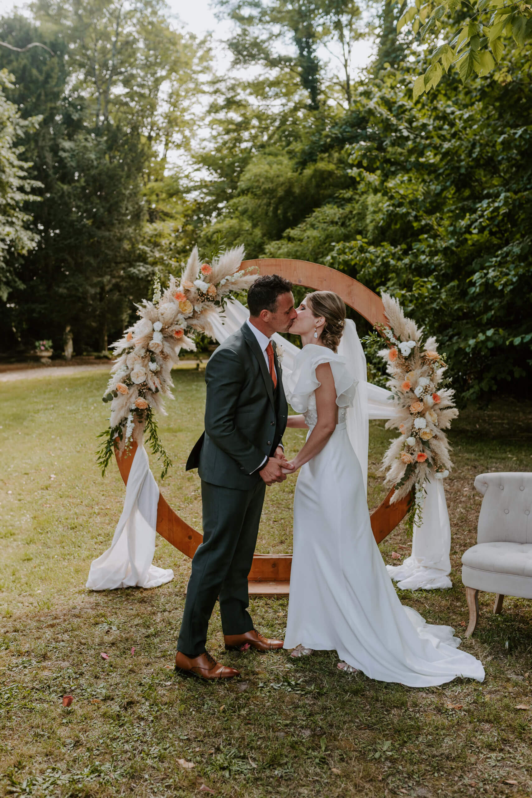 L’arche ronde en bois, sublimée par une abondance de pampas et de fleurs pastel, offrait un rendu à la fois aérien et romantique. Le style général, volontairement destructuré, apportait cette touche moderne et naturelle que les mariés souhaitaient.