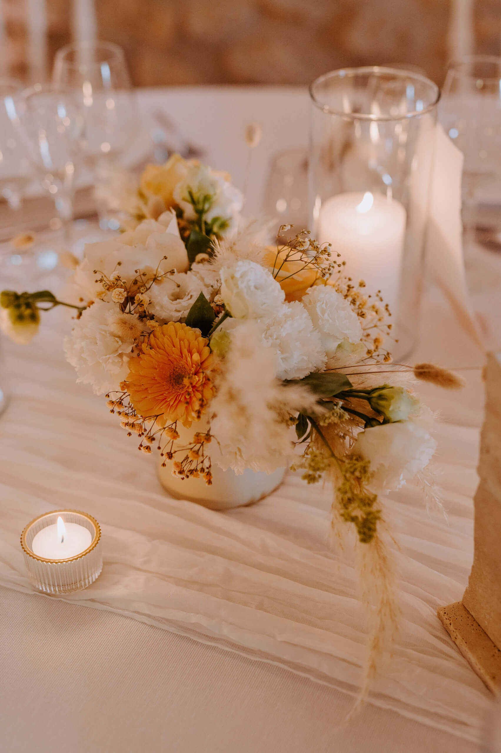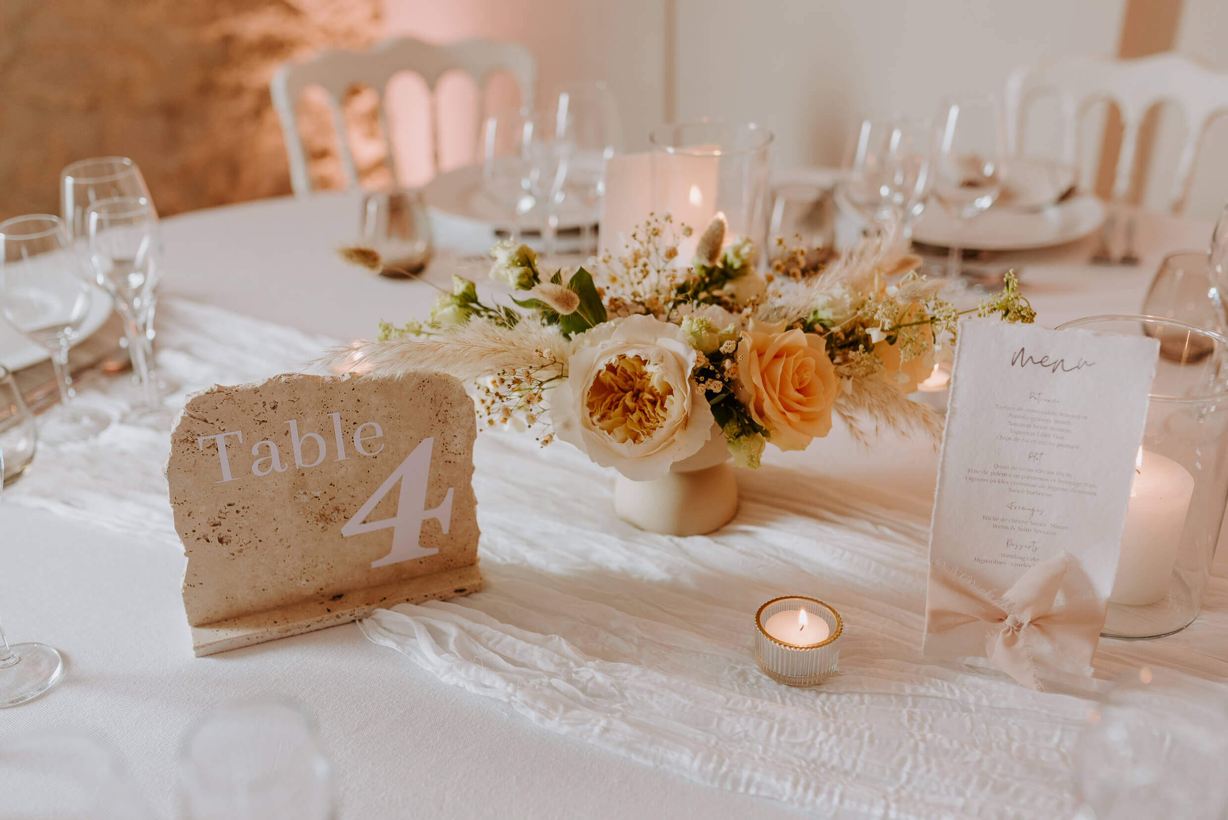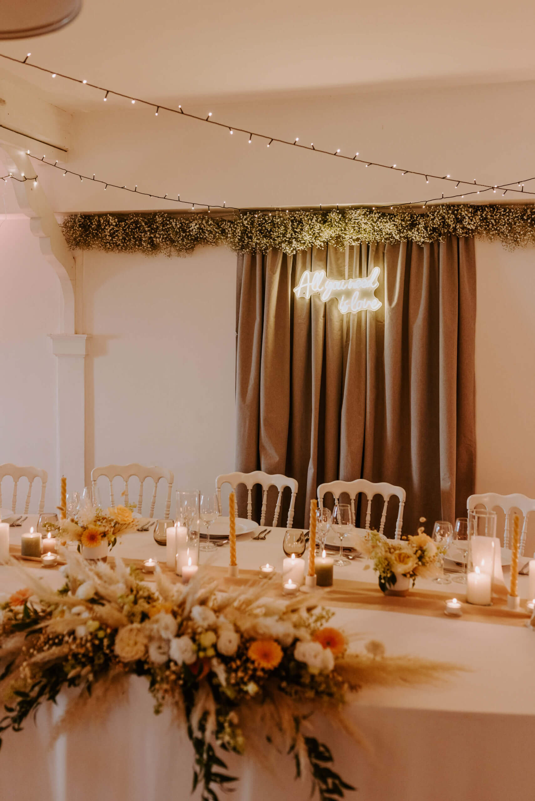 La table d’honneur, quant à elle, était mise en valeur par une composition allongée et légèrement retombante sur le devant, accompagnée de bougies pour une ambiance romantique et chaleureuse.